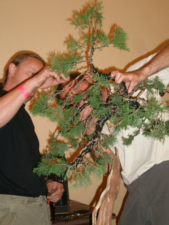 V sobotu popoludní vystúpil Vladimír Ondejčík s demonštráciou tvarovania borievky Juniperus sabina. Borievka mala krásny pohyb kmeňa i jednotnú líniu dlhých, prírodne vytvorených jinov, ktorých krásu sa tvarovateľ snažil zachovať a zvýtazniť. Všetky konáre rastúce dohora sa museli kvalitne zafixovať rafiou a páskami, aby sa dali urobiť výtazné ohyby. V korune zostalo viac zelene, ako by si to vyžadoval samotný tvar stromu, no viac konárov sa ponechalo kvôli ťahu živín i pre istotu, aby v budúcnosti bolo v korune dostatok zelene, ktorá sa budú postupne redukovať. Tvar koruny nie je konečný. Pri tomto tvarovaní zostava na ľavej strane v smere rastu kmeňa bohatšia zeleň. Postupne sa bude redukovať a ťažisko koruny sa prenesie viac doprava ( z pohľadu pozorovateľa), aby sa tak zvýšila dynamika koruny a kmeňa. Jiny, šari i kôra boli vyčistené no neboli natrené jin liquidom (mŕtve drevo) ani olejom (živá kôra). Tvarovanie a jeho výsledok ocenil i Walter Pall.