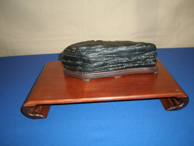 Miroslav Kment vystavoval suiseki s dokonalým povrchom, intenzívnou čiernou farbou, akú si vysoko vážia Japonci a výraznou horizontálnou členitosťou.