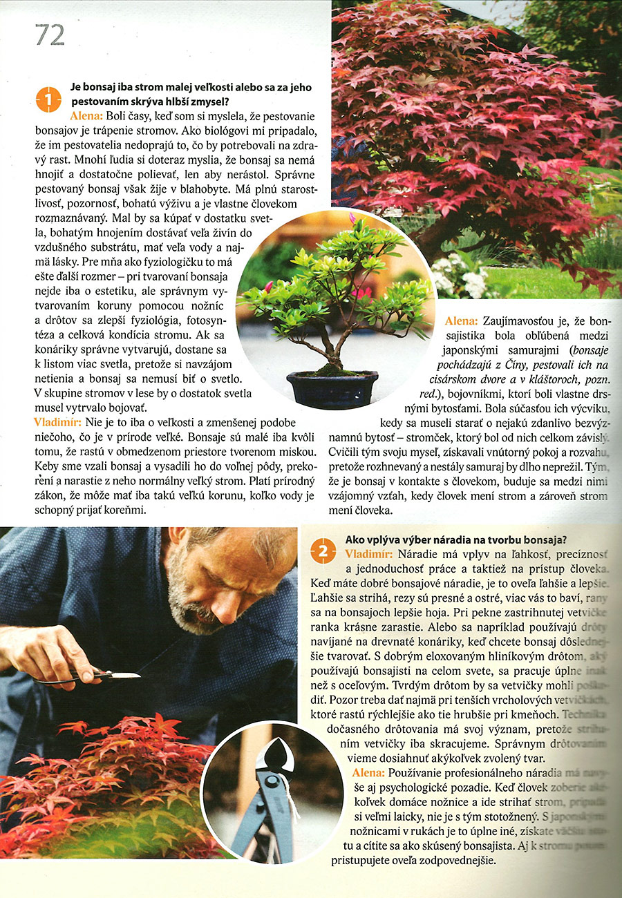 Alenka: Zaujímavosťou je, že bonsajistika bola obľúbená medzi samurajmi, bojovníkmi, ktorí boli vlastne drsnými bytosťami. Bola súčasťou ich výcviku, kedy sa museli starať o nejakú zdanlivo bezvýznamnú bytosť – stromček, ktorý bol na nich plne závislý. Cvičili tým svoju myseľ, získavali vnútorný pokoj a rozvahu, pretože rozhnevaný a nestály samuraj by dlho neprežil. Tým, že je bonsaj v kontakte s človekom, buduje sa tam vzájomný vzťah, kedy človek mení strom a zároveň strom mení človeka.