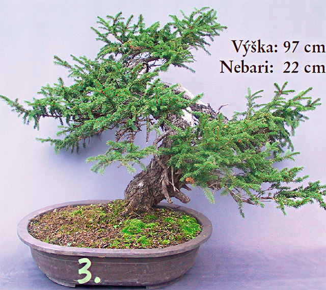 3. Mal som vo svojej záhrade viacero yamadori a rozmýšľal som, ktorý zo stromov bude najvhodnejší. Moje myšlienky smerovali k tvarovaniu. Nakoniec som si vybral smrek. Keď som strom položil na otočný stolík a viackrát som menil jeho pozície, definitívne som sa rozhodol pre čelný pohľad, pri ktorom nielen nebari (rozšírená báza kmeňa) bolo očividné, ale aj klasický pohyb kmeňa.
