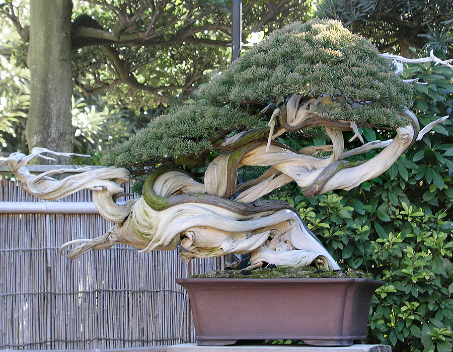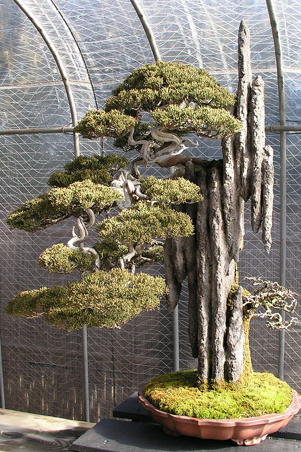 Masahiko Kimura nás privítal vo svojej záhrade, na ktorú sme boli veľmi zvedaví. Bola to pre nás česť vstúpiť do kráľovstva bonsajov najväčšieho umelca našich čias. Kým chystal so svojimi úslužnými pomocníkmi bohaté občerstvenie na veľkom stole uprostred záhrady, v ktorej dominovalo jazierko s obrovskými pokojnými koi kaprami a „zajačie" klietky s desiatkami čudných mačiek, mali sme dostatok času prezrieť si bonsaje, ktoré ako slávne top modelky zo stránok svetových magazínov poznajú milovníci bonsajov v mnohých krajinách. Ani najdokonalejšie fotografie však nezachytia to úžasné fascinujúce i burcujúce žiarenie, ktoré robí Kimurove stromy tak neodolateľnými. Dívali sme sa na ne zblízka a študovali sme i drobné detaily vo vnútri koruny ukryté pred pohľadmi divákov rovnomernými plochami drobného ihličia. A hoci majster Masahiko Kimura sám o sebe hovorí, že porušil tradície starej japonskej školy a vytvoril si vlastnú vonkajšiu formu bonsajov preto, aby bonsajistika nezastarala, neskostnatela, ale bola živým, vyvíjajúcim sa umením, týka sa to predovšetkým vonkajšieho vzhľadu jeho bonsajov. Zhodli sme sa, že i v tých najbizarnejších kreáciách sú základné princípy klasickej japonskej školy, z ktorej majster Kimura vyšiel, zachované. Princípy zlatého rezu, umiestnenie, smer i dĺžka prvej vetvy, postupnosť ukladania ďalších vetvičiek stromu, zachovanie prirodzenej mandaly rastu, bonsajová „geometria", pomery výšok, šírok a dĺžok jednotlivých komponentov i dokonalé rozloženie tých najmladších konárikov ctili tradície japonskej školy, aj keď štýl a autorské vyjadrenie boli viac ako novátorské. A ešte čosi je podľa slov majstra Kimuru je v súlade so starou japonskou bonsajistikou. Okrem vonkajšieho štýlu majú bonsaje svoju vlastnú dušu, a vnútornú esenciu, ktorá je po stáročia nemenná. Je v nich boh, krása a mier.