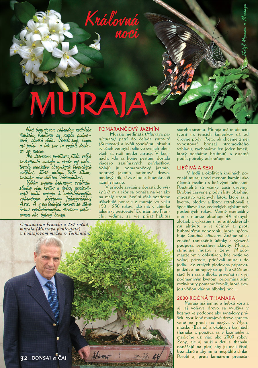 Muraja krásne kvitne a aj jeden jediný kvietok zaplní miestnosť sladkou aktivizujúcou vôňou. Jej biele kvety krásne vyniknú na zložených 9-početných sýtozelených listoch. Muraja ako bonsaj prináša pestovateľovi veľa radosti a je veľmi vďačným, krásnym, zdravým, prítulným, no jednoducho jedinečným stromom, ktorý sa ľahko spriatelí s človekom.