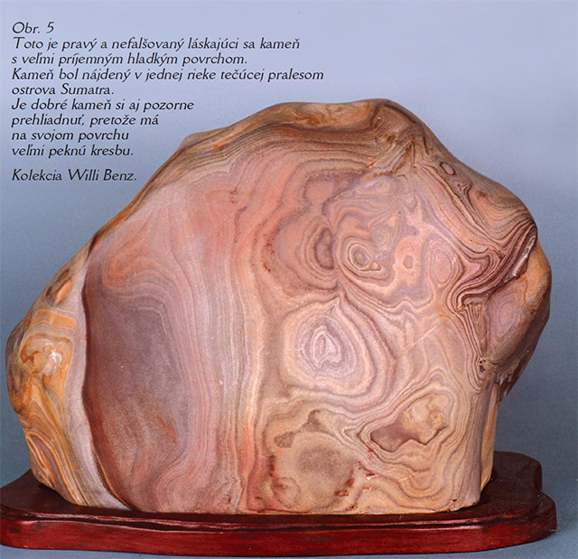 Iný zážitok môžeme s kameňmi získať, ak sa ich budeme dotýkať alebo ich hladkať. Niektoré kamene majú zvlášť hladký povrch, ktorý v nás po dotyku vyvoláva príjemný pocit. Tieto kamene sa niekedy označujú ako láskajúce sa kamene, pretože po ich uchopení pôsobia na náš citový svet a dokážu sa človeku zalíškať. Sú ľudia, na ktorých to tak zapôsobí, že cítia, akoby energia nahromadená po tisícročia v kameni sa po dotyku preniesla na človeka (obr. 5).