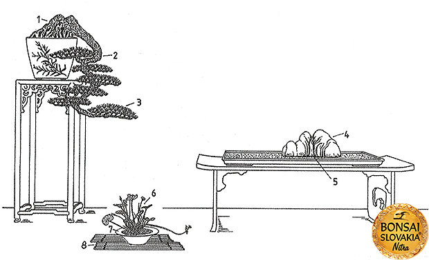 Toto je výstavný výklenok, japonsky tokonoma. Spravidla v nej bývajú vystavené dva alebo tri objekty. Ich asymetrické umiestnenie je vyššou zákonitosťou. Riaďte sa pritom pravidlom zlatého rezu. Princíp zlatého rezu je popísaný v magazíne Bonsaj a čaj č. 1.